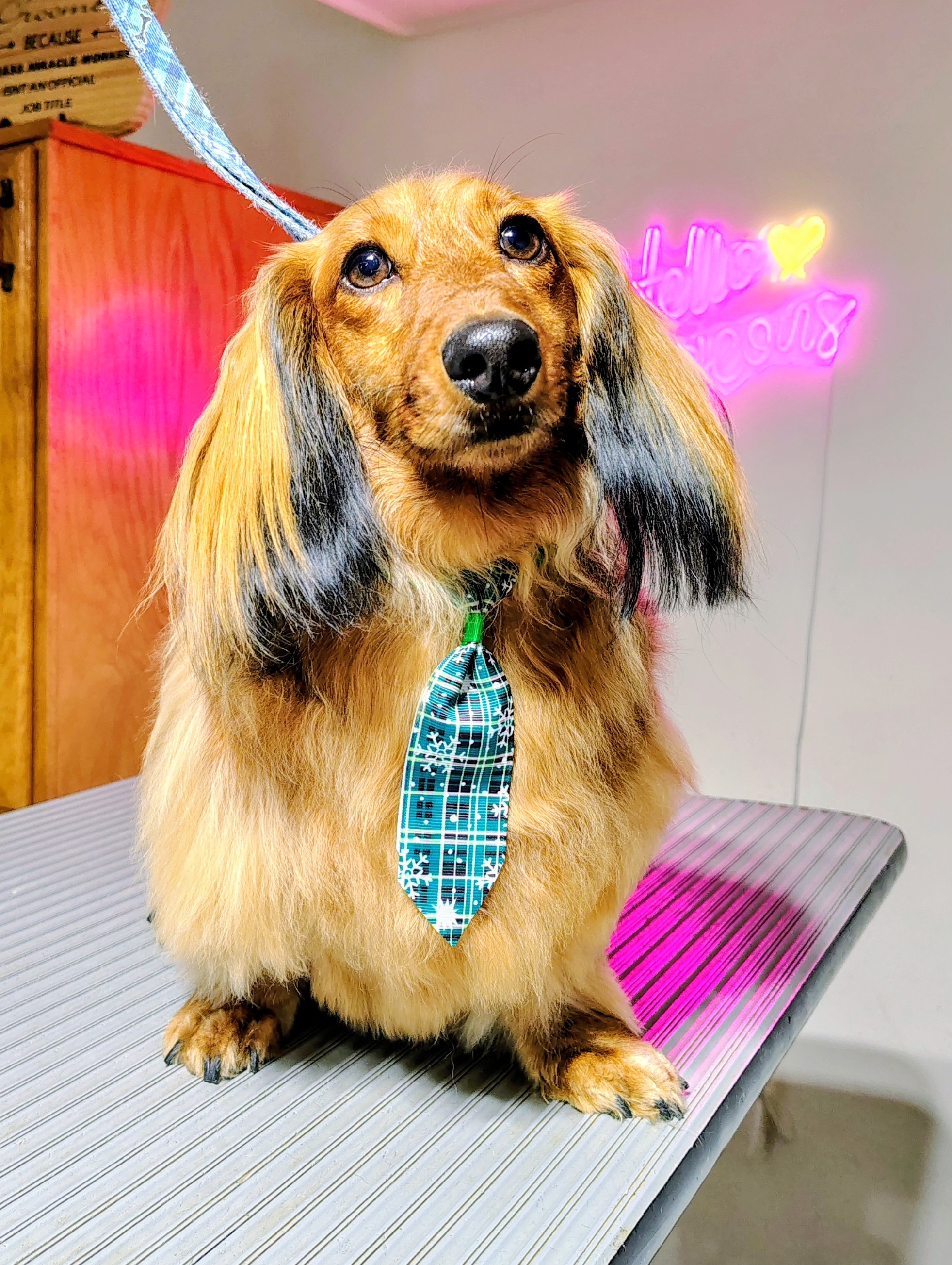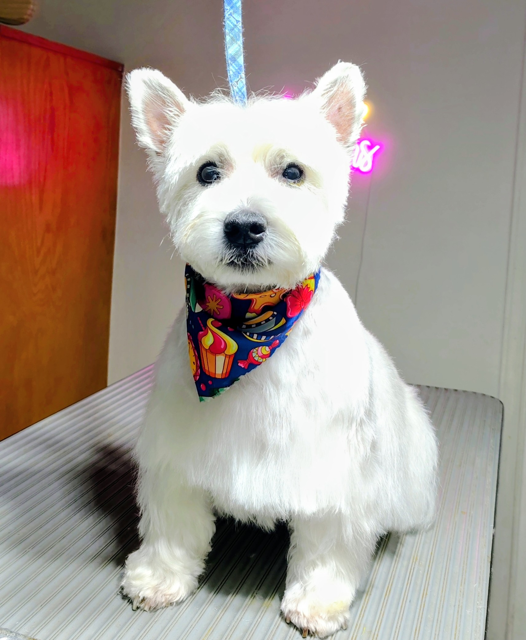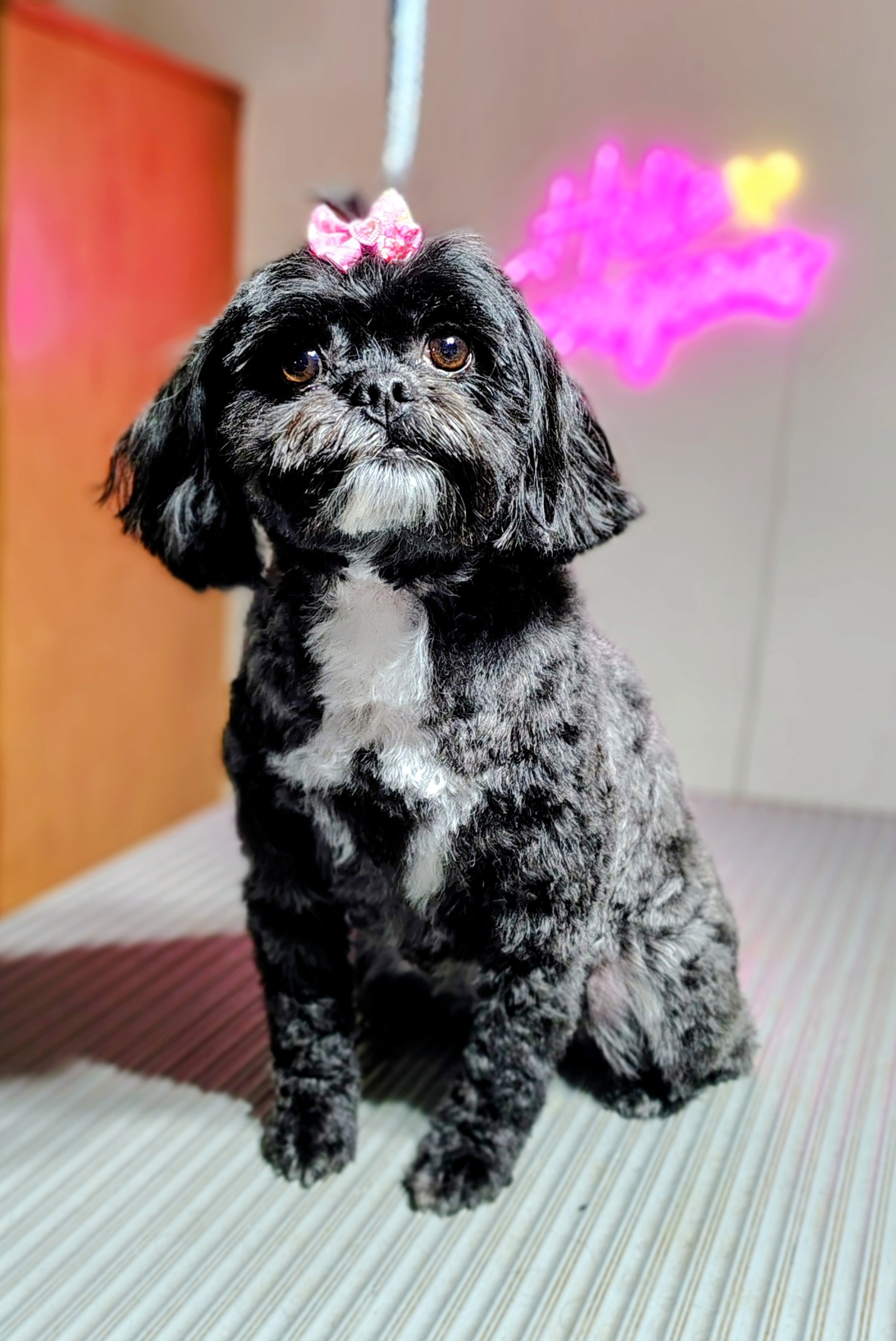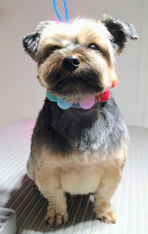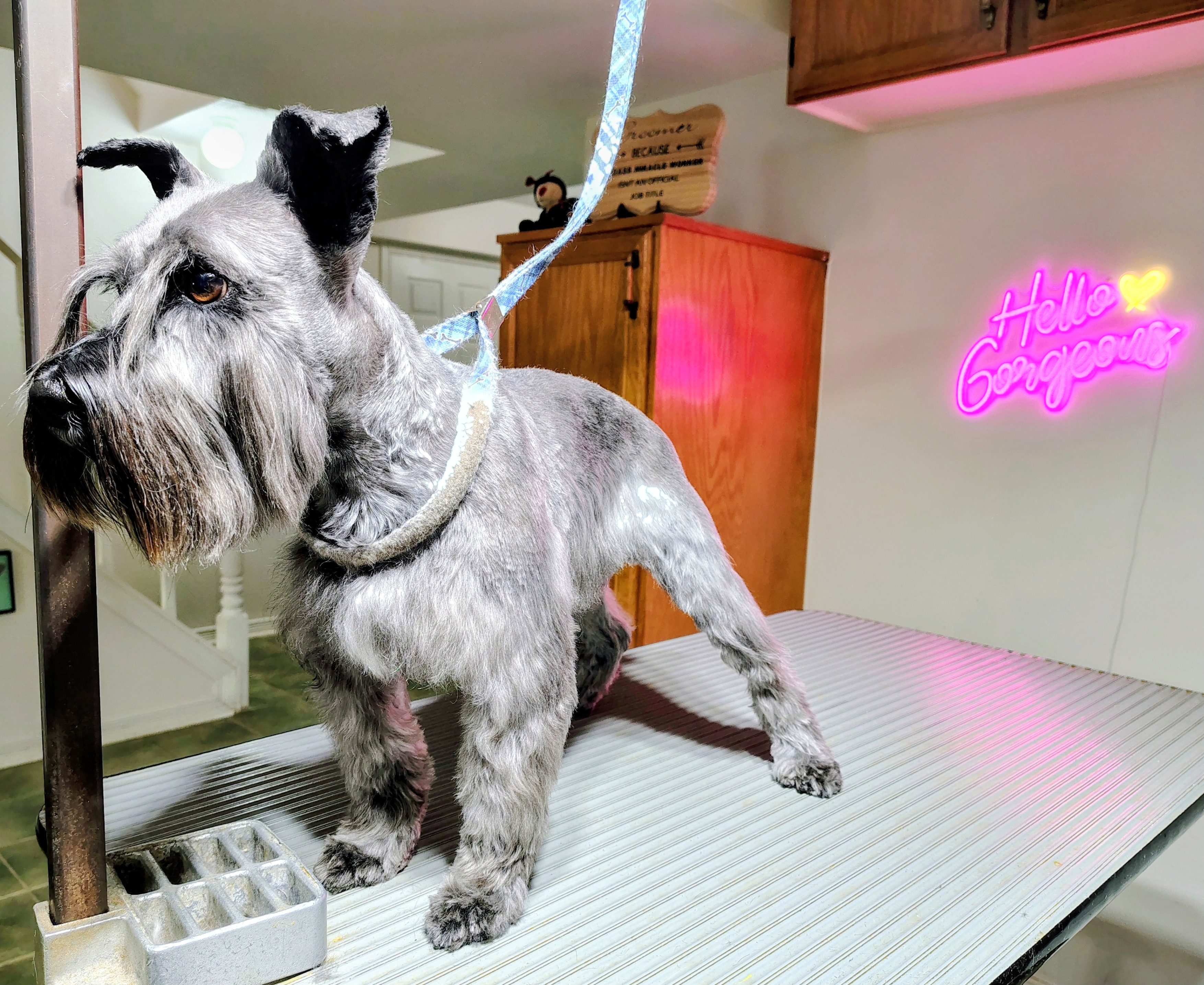 Let the fur fly; full body trim/breed clip, bath, nail trimming, and ear plucking/cleaning. De-matting, extra brushing add an extra 10$ per half hour of work